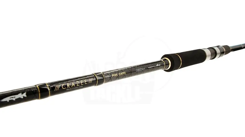 Eine zweiteilige, 2,60 m lange Hechtrute mit 21 bis 85 g Wurfgewicht und Regular Taper von A-TEC Japan. Die Crazee Pike Game S862X eignet sich durch ihr kraftvolles Backbone, eine geschmeidig arbeitende Spitze und den verlängerten Rear Grip hervorragend für das Hechtangeln mit großen Softbaits. Basierend auf dem Blank der Heavy Rockfisch Ruten wurde mit der Crazee Pike Game Rutenserie der Grundstein für eine exklusiv auf das Hechtangeln ausgerichtete Rutenserie mit hervorragendem Preis-/Leistungsverhältnis gelegt. Optisch elegant in gold-schwarz gehalten, sind die Crazee Pike Game Hechtruten kombiniert mit ihrem schwarzen Duplon/EVA Split Grip ein echter Augenschmaus. Technisch haben wir den Blank soweit angepasst, dass die ursprüngliche Aktion der Heavy Rockfish erhalten bleibt, die Crazee Pike Game aber insbesondere in Richtung Rear Grip um ganze 10 cm verlängert. Hierdurch haben wir eine signifikante Verbesserung der Wurfperformance und des allgemeinen Handlings erreicht. Die Pike Game Ruten fühlen sich jetzt speziell bei ausdauernden Sessions deutlich angenehmer im Umgang mit schweren/großen Hechtködern an. Ausgestattet mit einem langlebigen und robusten FUJI O Guide Ringsatz sowie dem FUJI Reel Seat, steht dem Hechtangeln mit einer speziell dafür konzipierten A-TEC Rute nun nichts mehr im Weg.